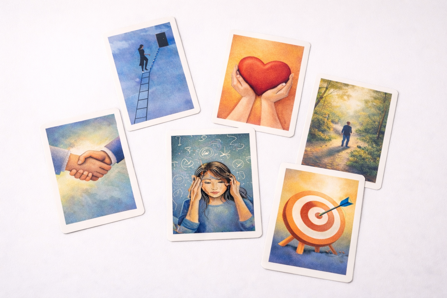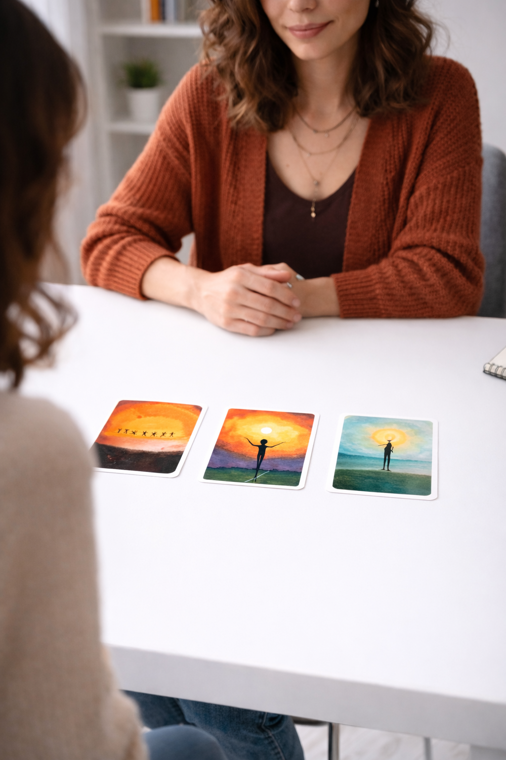 En séance, les cartes servent de point d’appui à une exploration intérieure. Vous venez avec une question, une situation, quelque chose qui vous pèse ou vous bloque. Les cartes tirées ne donnent pas de réponse toute faite, elles ouvrent un espace de réflexion, révèlent des angles que vous n’aviez pas envisagés, mettent des images sur ce que vous n’osiez peut-être pas formuler.